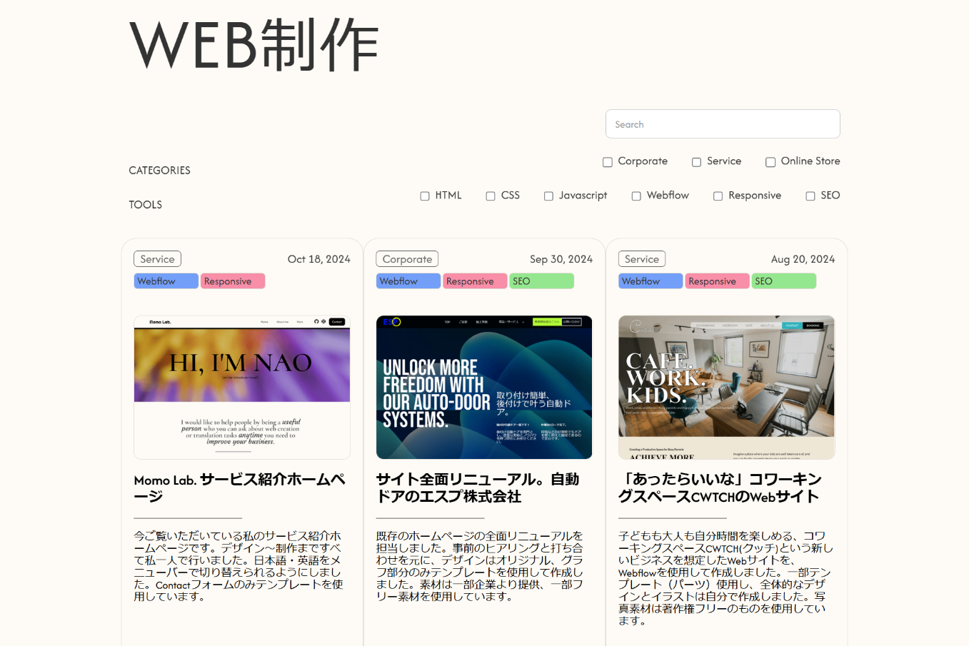 デザイン~制作まですべて私一人で行いました。CMS機能を使って制作物を表示しています。